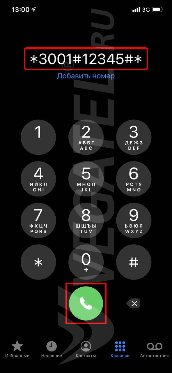 Сначала отключите Wi-Fi. Убедитесь, что телефон работает в режиме 3G (значок 3G, H или H+ на телефоне). Наберите код *3001#12345#* и нажмите кнопку «позвонить». Так вы попадете в инженерное меню iPhone.