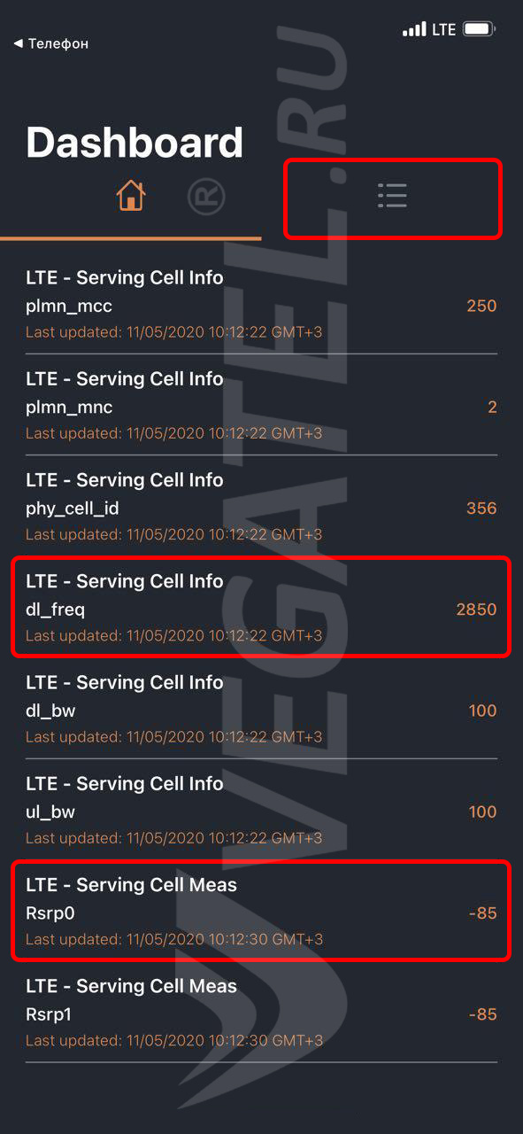 LTE - Serving Cell Info (dll_freq): 2850 – Номер подключенного канала: