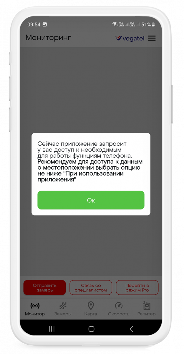 Для корректной работы приложения необходимо предоставить права доступа к телефону и местоположению. Местоположение понадобится для определения геолокации пользователя и вышек, которые находятся рядом. Телефон необходим для связи с нами и некоторых технических особенностей измерения сигнала. Не беспокойтесь, мы не собираем персональные данные пользователей, все строго конфиденциально.