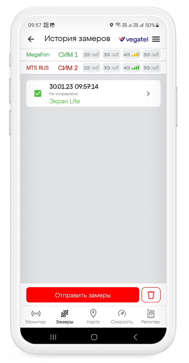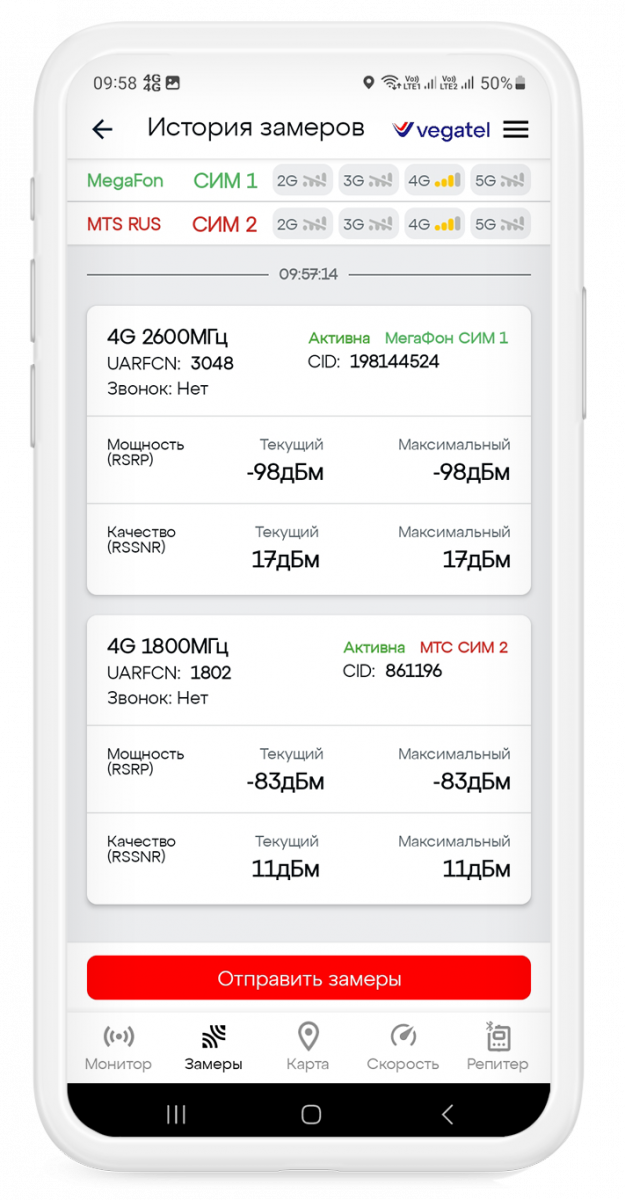 Вы сможете мгновенно определить, к каким частотам и стандартам подключается телефон и какие из них доступны для подключения, во вкладке Замеры. Там же вы найдете инструкцию по проведению комплексных замеров, что сэкономит время. История замеров позволит вам отследить историю ваших замеров.