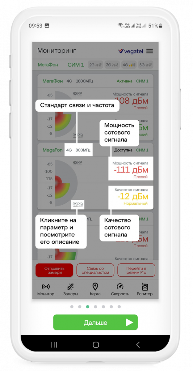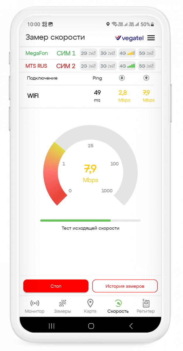 Приложение "VEGATEL Сотовые вышки" определяет частоту, уровень и качество сигнала сети сотового оператора, а также помогает находить доступные для подключения каналы и осуществлять мониторинг изменения подключений. Еще оно может измерить скорость вашего интернет-соединения. Более того, теперь вы можете удаленно управлять некоторыми усилителями прямо через приложение VEGATEL.