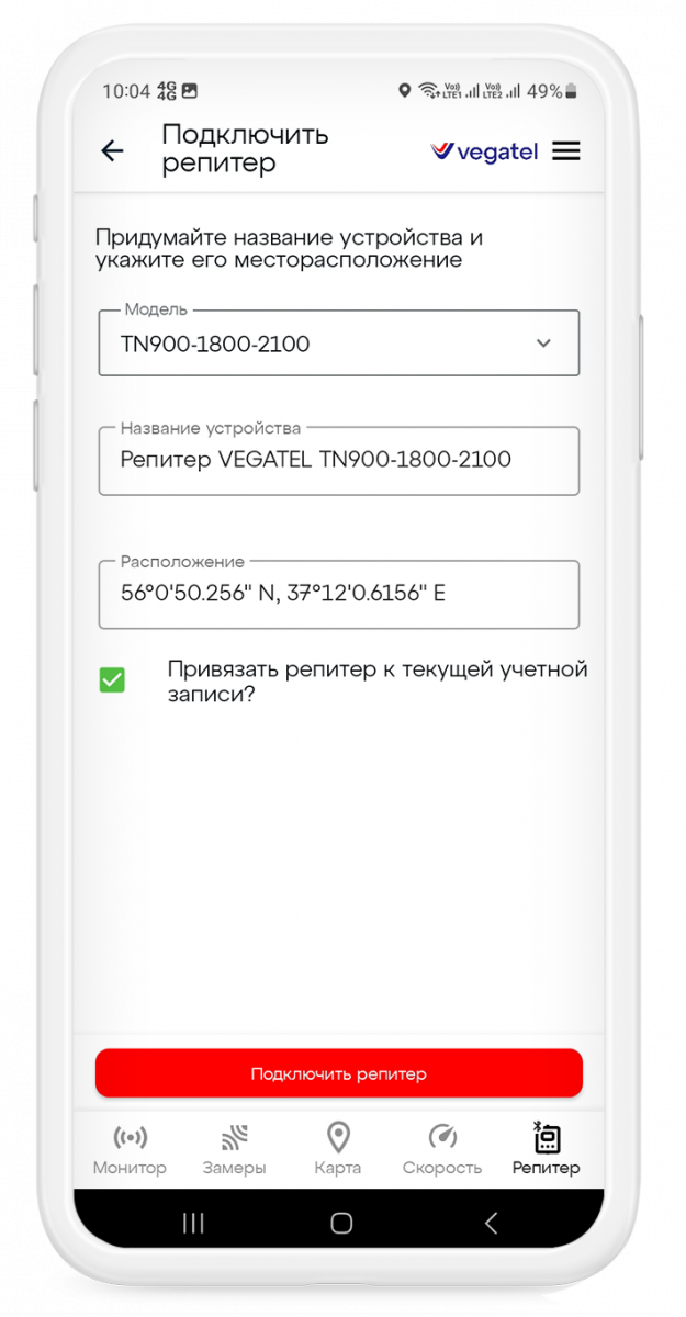 Многие наши репитеры имеют возможность управления напрямую через приложение VEGATEL. Последняя вкладка Репитер дает возможность управлять системой усиления сотовой связи с помощью вашего смартфона. Подробнее о том, как управлять репитером через приложение – в нашей статье: Управление репитерами через приложение VEGATEL.