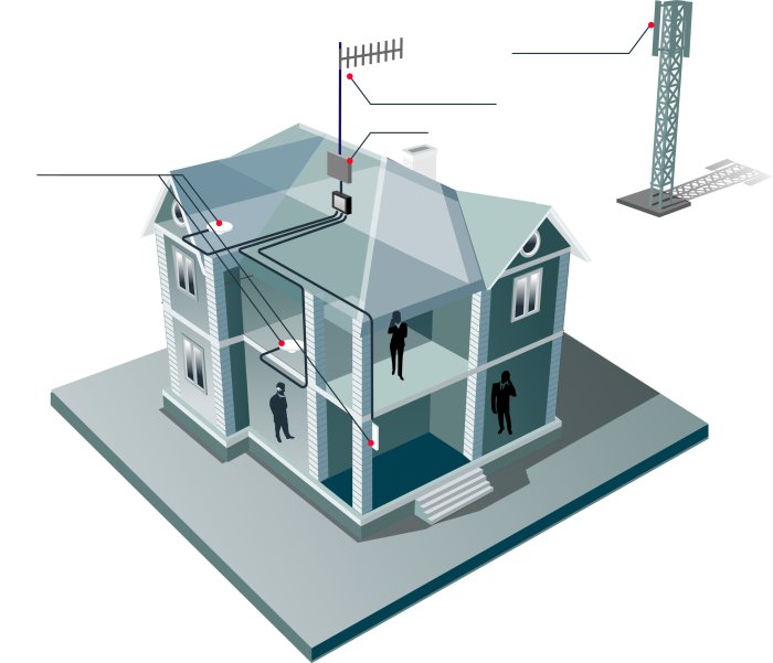 Усиленный сигнал сотовой связи распространяется внутри помещения с помощью комнатных антенн.