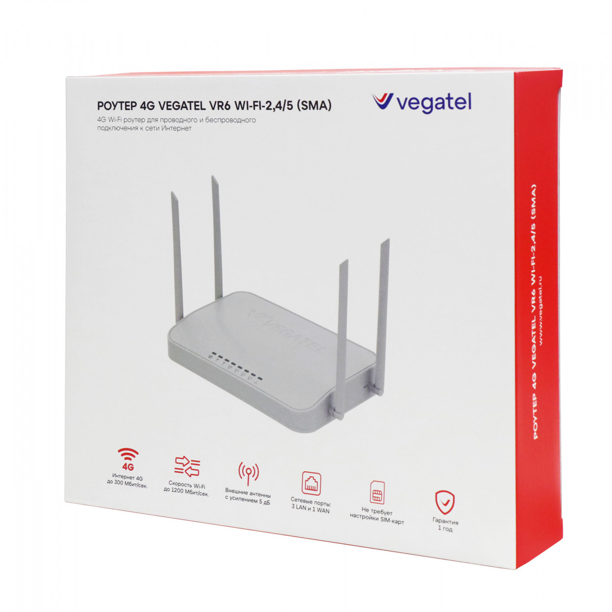 Двухдиапазонный Wi-Fi 4G роутер VEGATEL VR6 — ультимативное решение для дома или офиса. Роутер может получать интернет по кабелю или через сверхбыстрый (Cat.6) мобильный 4G/LTE-интернет со скоростью до 300 Мбит/с.